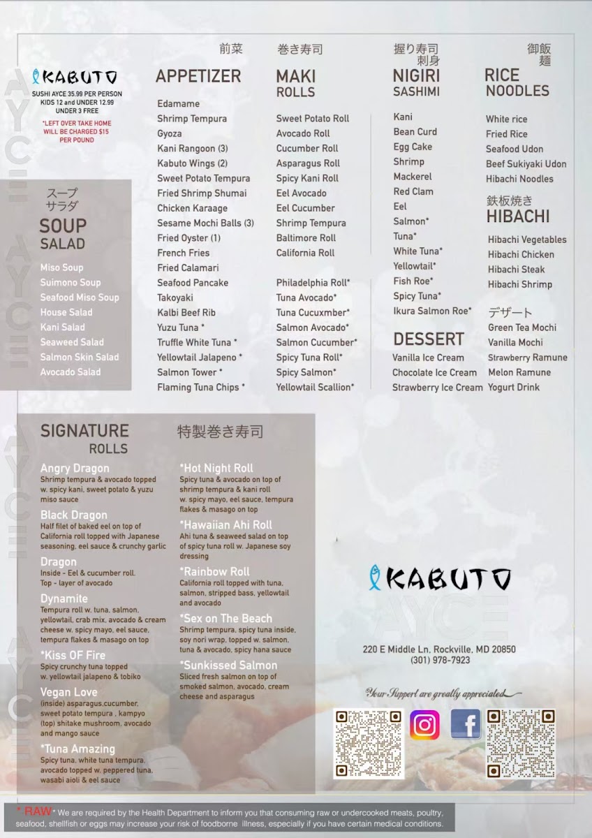 If you're looking for a memorable dining experience, the Kabuto Hibachi & Sushi Menu offers a delightful selection of flavorful dishes that will have you coming back for more. Located at 220 E Middle Ln in Rockville, MD, this spot brings together the best of hibachi grilling and sushi craftsmanship in a cozy, welcoming atmosphere. Whether you’re a fan of sizzling meats and vegetables cooked right in front of you, or you prefer the freshness of expertly rolled sushi, Kabuto has something to satisfy every craving.
